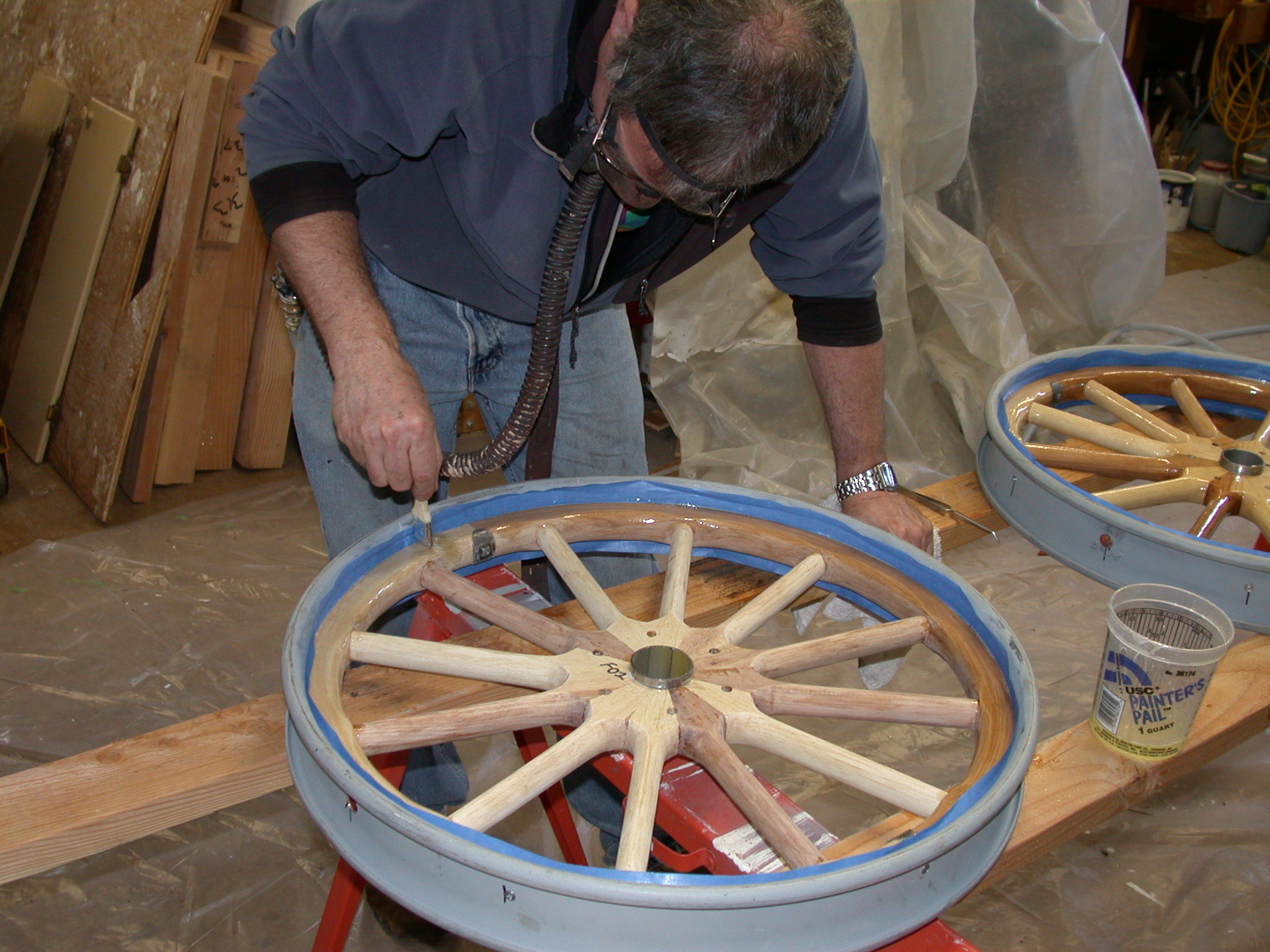 Here I am painting a coat of epoxy paint onto the wheels. I used the same epoxy paint as I used on the body. I applied three coats of epoxy paint to the wheels. April 2007